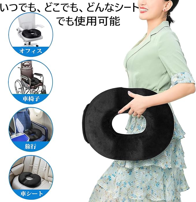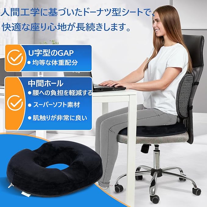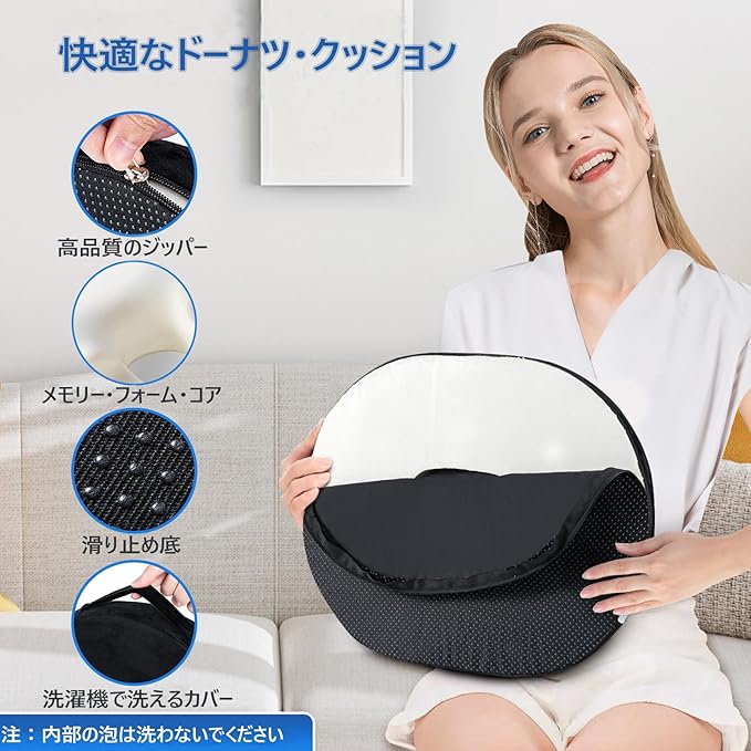 【医師推奨の痔用クッション - 美しいパッケージ】-ドーナツクッション 高密度メモリーフォーム 産後の痔、尾骨、臀部の痛みに適しています 通気性 滑り止め底 (黒)