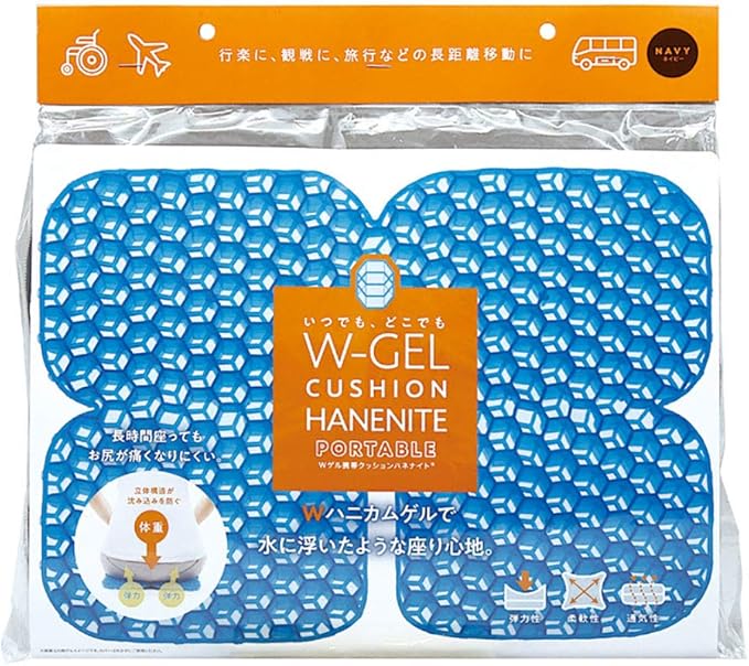 大ヒット商品「ハネナイト」が携帯クッションになりました! Wハニカムゲルで水に浮いたような座り心地。 長時間座ってもお尻が痛くなりにくい。 立体構造が沈み込みを防ぐ。 バッグに入れて持ち歩ける。行楽に、観戦に、旅行などの長距離移動に。 サイズ/使用時:34 26.5 3cm 折りたたみ時:26.5 16.5 6cm(持ち手含まず)