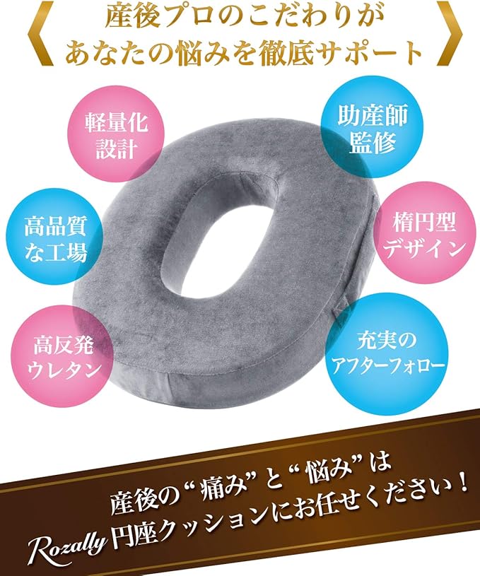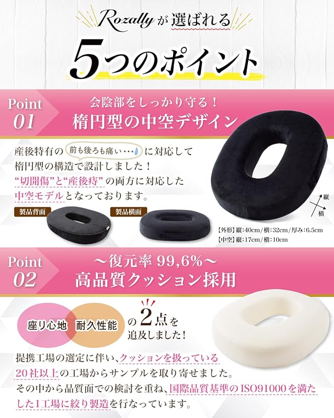 【こだわり】様々なHOTから”円座クッション”や”産後クッション”が販売されていますが、Rozallyの円座クッションは”座り心地”と”耐久性能”が一味違います。クッション系を取り扱っている20社以上の工場からサンプルを取り寄せ、国際品質基準をクリアしている選りすぐりの1社でのみ製造を行なっております。