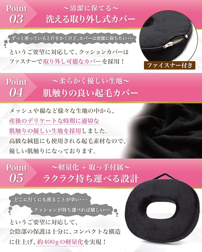 【産後ママのために!】出産時に発生する切開傷、痔など座ることが辛い…という方に向けて作られた”円座クッション”です。会陰部~お尻にかけて座った時に地面に触れないようにドーナツ型 (楕円型) の設計で開発されたクッションです。出産後のトラブルに詳しい【助産師&看護師の先生】にアドバイスをもらい、少しでも楽に座れるようにという思いが込められています。