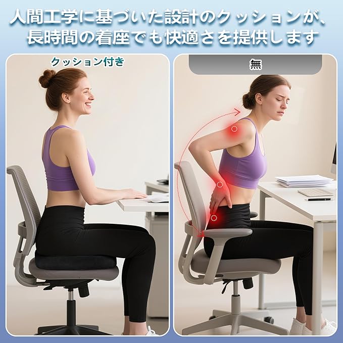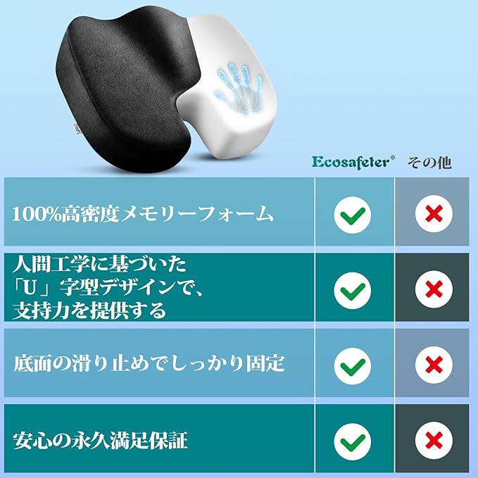 ✔️【圧力分散設計】 Ecosafeterシートクッションは、体型にフィットする高密度メモリーフォーム製で、尾骨部位には独特の凹みが設計されている。U字型デザインは、座る人の体重を適切に分散し、お尻に快適なサポートを提供します。あらゆるオフィスチェアに長時間座るのに最適です。