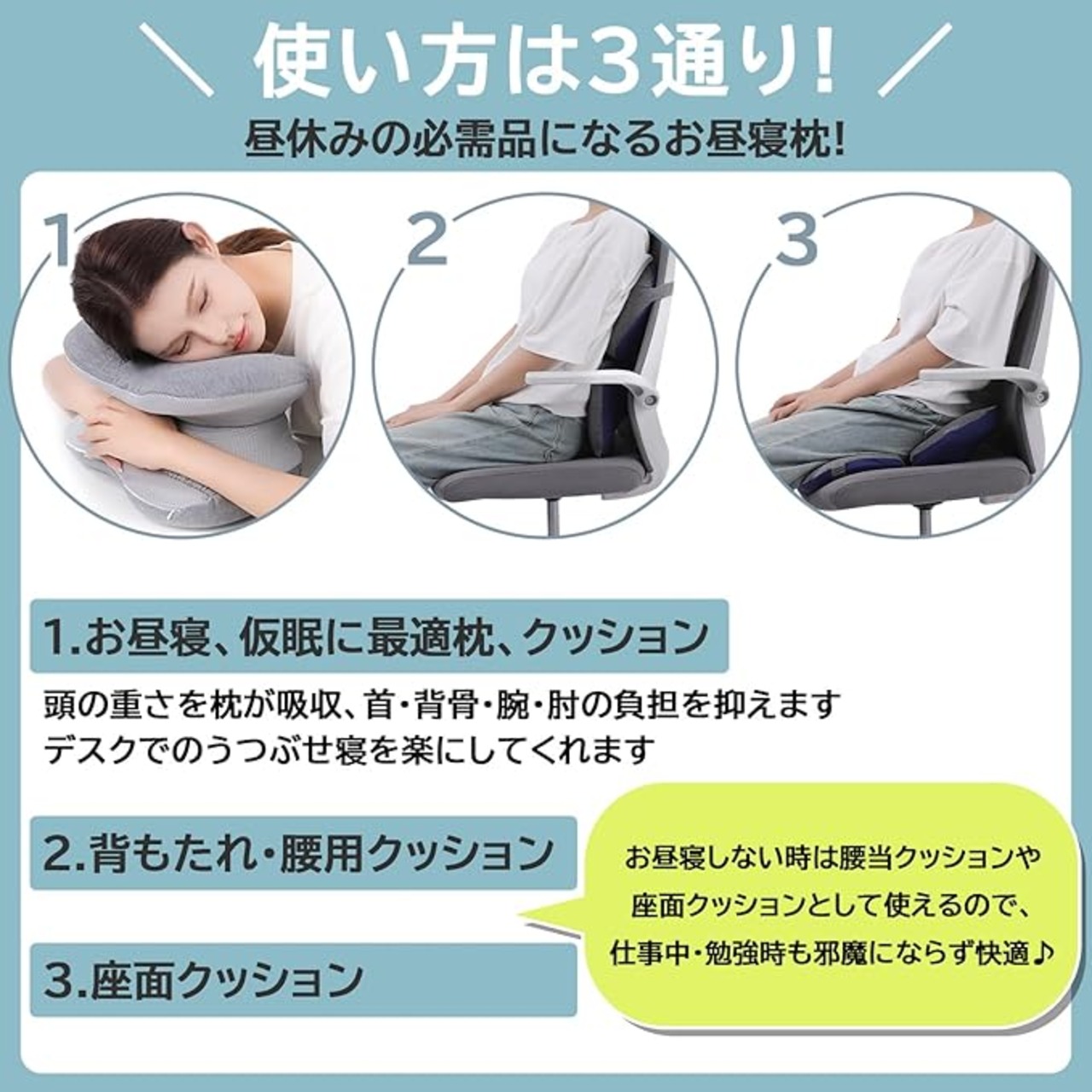✅3WAYタイプのクッションで、広げた幅は41cm 35cmと大きめ。ゴムバンド付きでずれにくいので、作業中は背もたれに立てかけて姿勢を保つクッションや、あるいは快適な座り心地をサポートするお尻用クッションとしてお使いいただけます。まさに多機能なお昼寝枕です