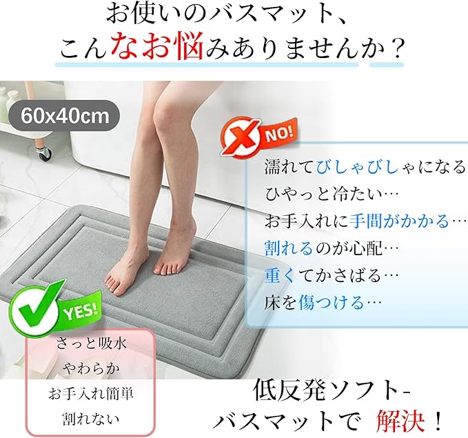 バスマット トイレマット ふわふわ/洗える セット 40*60 浴室まっと 低反発 足ふきマット 厚い 足拭き 、速乾 吸水 お風呂 滑り止め あしふき、トイレ 便器 丸洗い可能 洗面所 脱衣所 浴室 キッチン 台所 (グレー)