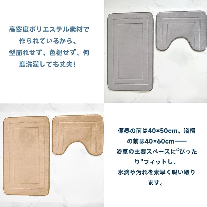 モダンデザインのバスマットセット:お風呂マットは 40 60cm + 40 50cm のサイズで、ベージュ・グレーなど色選択があります。モダンでシンプルなデザインは、トイレマットや洗面所マットとしてどんなインテリアにもマッチし、おしゃれな空間を演出します。