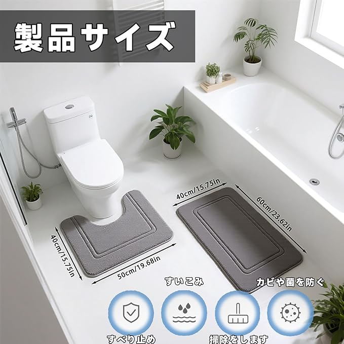 吸水力抜群のバスルームマットセット:セットには「U 型」のトイレマットと「長方形」の足マット(あしふきマット)が含まれ。お風呂上りに足拭きすると、水分を素早く吸収し、浴室をサラサラに保ちます。