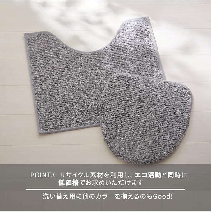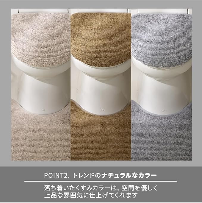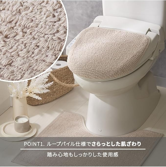 優しいナチュラルカラーでレストルームを癒やしの空間に演出するトイレマットとフタカバーの2点セットです。
