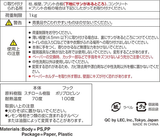 材質 本体=スチロール樹脂、フック=ポリプロピレン