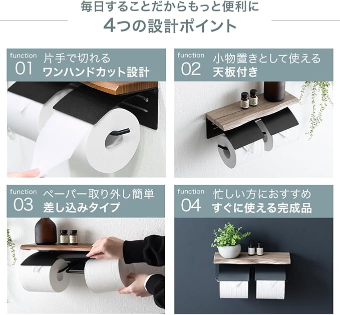 【スタッフのおすすめポイント!】・静音&片手で切れるトーションばね搭載 ・紙を切りやすい捌(はち)付きフタ ・芯なしや3倍巻きも設置OK ・高級感と温もりを生む“なぐり加工”天板 ・天然木の質感を再現したエンボス加工