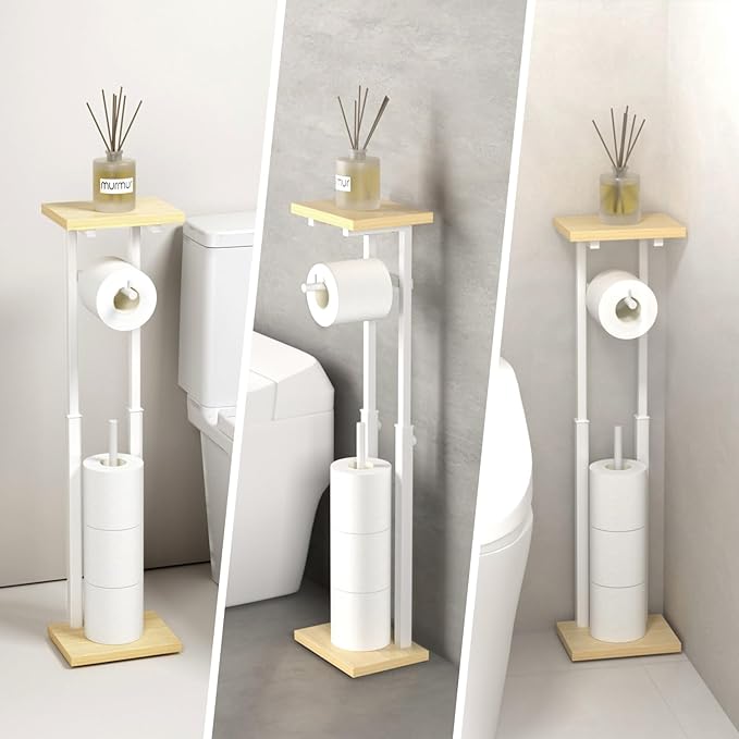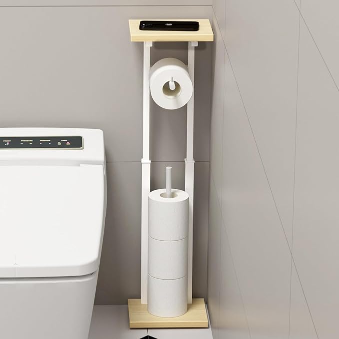 PRTONE トイレットペーパーホルダー 自立式 高さ約60.5/68.5/76.5cm三段階調整でき ペーパーホルダー 紙巻き器 おしゃれ 積み重ねタイプ トイレットペーパースタンド 置き型 木製棚付き スリム トイレ 収納 ラック ナチュラル