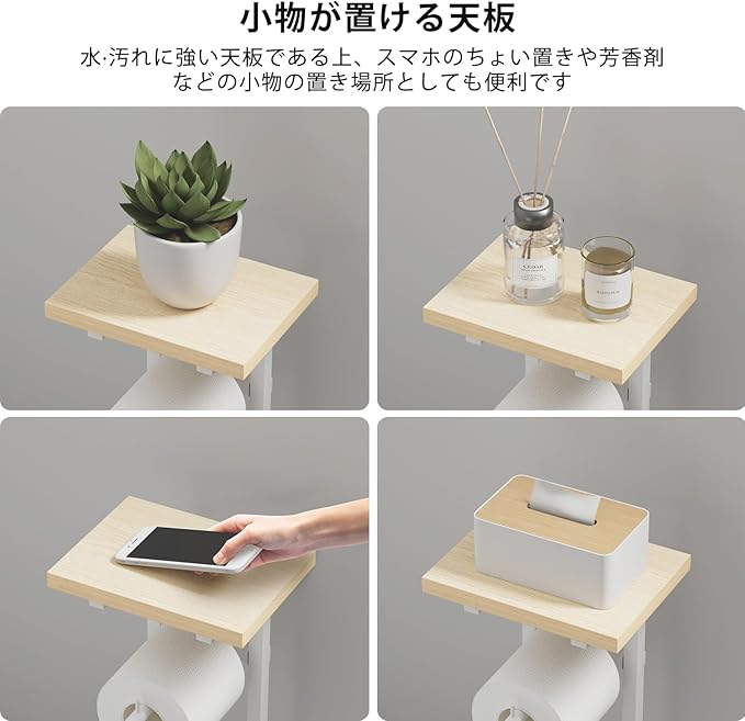 【小物などが置ける天板付き】小物などが置ける天板付きの置き型 トイレット ペーパーホルダーですので、携帯電話、ウェットティッシュ、アロマテラピー、鍵などの小物を収納でき、トイレなどの空間をすっきりさせます。