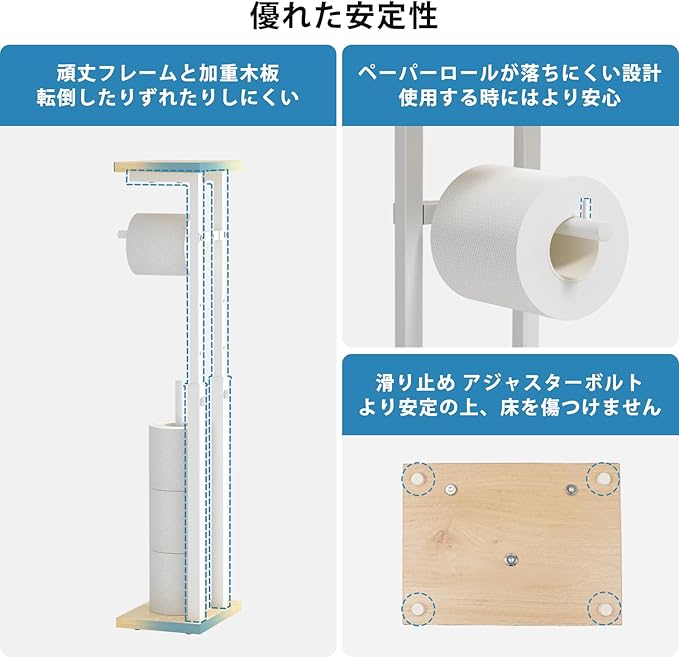 【優れた安定性】 頑丈フレームと加重木板を採用して、転倒したりずれたりしにくいトイレットペーパースタンドである上、底には滑り止め アジャスターボルトが付いており、安定性をよりアップして、床も傷つけません。また、ペーパーロールは落ちにくい設計で、安心してご使用いただけます。