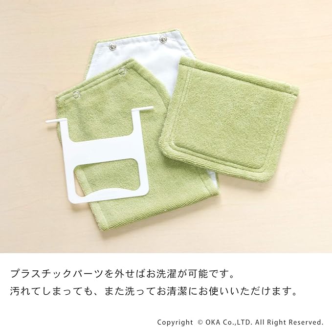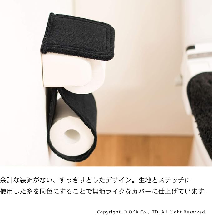 その限定商品のトイレマットやカバーとお揃いのトイレットペーパーホルダーカバーは、マットと同様、余栄な装飾がなくシンプルな無地デザインでトイレットペーパーホルダーをカバーします。ステッチも同色の糸を使用することで無地ライクなカバーに仕上げています。このトイレットペーパーホルダーカバーは上部と下部を一つのプラスチックパーツでつなげています。お手入れ時にはサッと取外し、簡単に取り付けることができます。