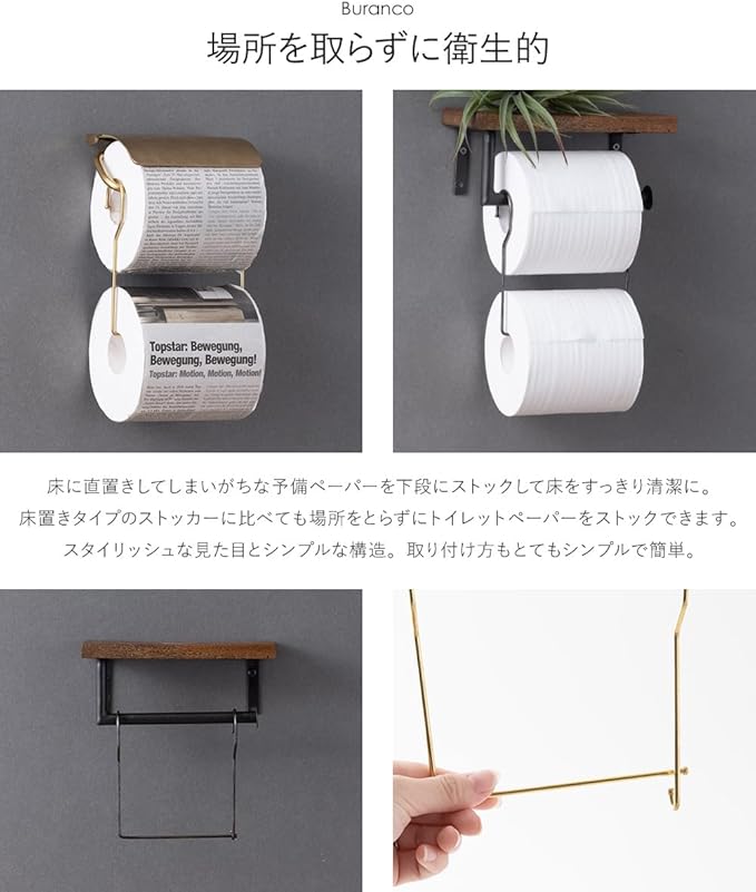 ※備え付けのトイレットペーパーホルダーの芯に通す部分が短い、斜めになっているなどの形状の場合、フック部分が芯内部に食い込みやすくなります。 ※画像内に使用している「ペーパーホルダー ブラス」にもご使用いただけますが、芯引っ掛け部分が短いため、上段のペーパーが残り少なくなるとフック部分が芯の内側に引っ掛かる場合があります。 ※一つ一つ手作りのため、形には多少の違いが出ることがあります。