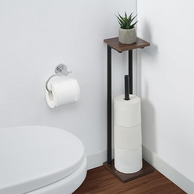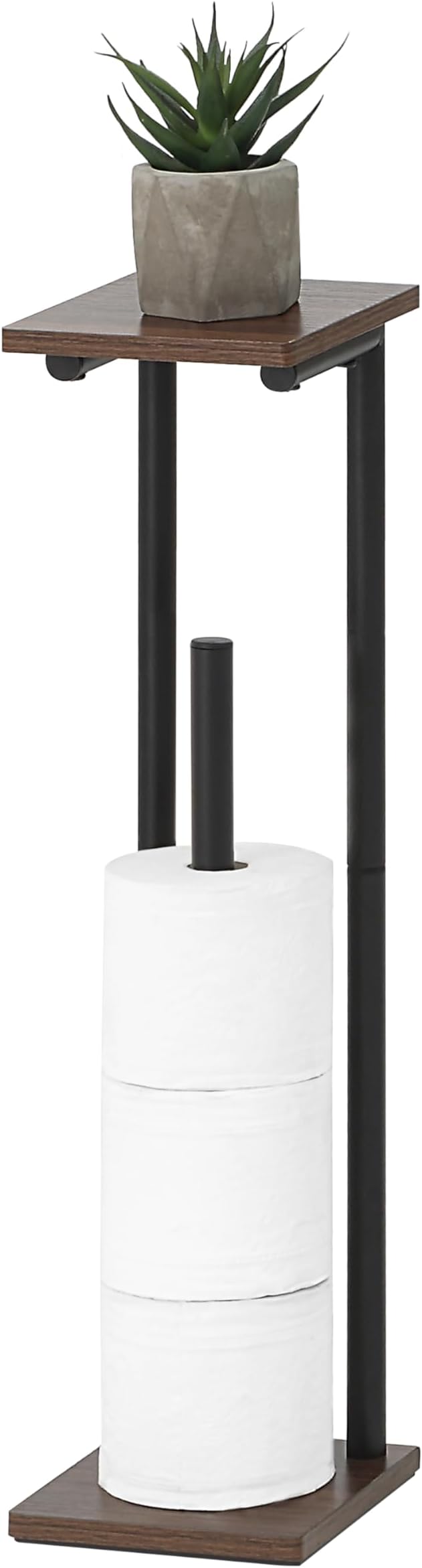 サニーポイント 自立 トイレットペーパースタンド 収納 トイレ スリム 木製棚付き ラック スマホ置き イレットペーパーホルダー 隙間収納 ティッシュホルダー (ブラック, 1段)