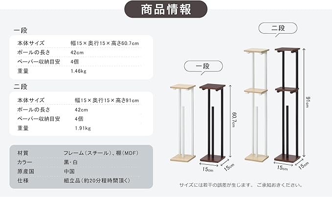 製品仕様】1段本体サイズ:幅15 奥行15 高さ60.7cm、ポールの長さ:42CM/ペーパー収納目安 : 4個/重量:1.46KG/材質:フレーム(スチール)、棚(MDF)/組立品(約20分程時間頂く)