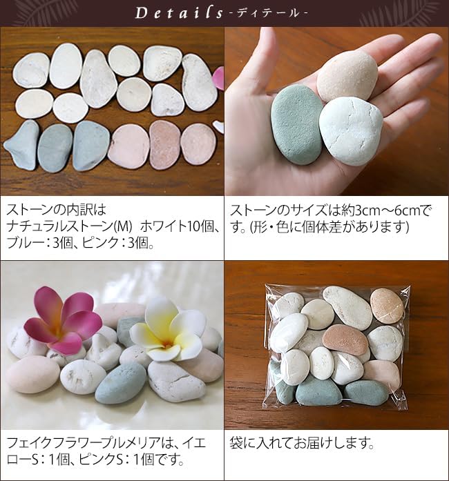 南国コーデの名脇役のストーン(ホワイト、ブルー、ピンク)に、本物みたいと人気の南国のお花プルメリアの造花のセットで、届いたらすぐに写真のように飾っていただけます。 南国バリ島の素敵なホテルでも、装飾やインテリアとして使われている自然の石です。自然ならではの一つ一つ異なる表情が味わいをプラスし、石の風合いが爽やかさも演出。これを飾るだけでリゾート気分を味わえます。
