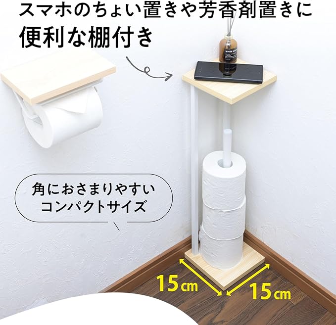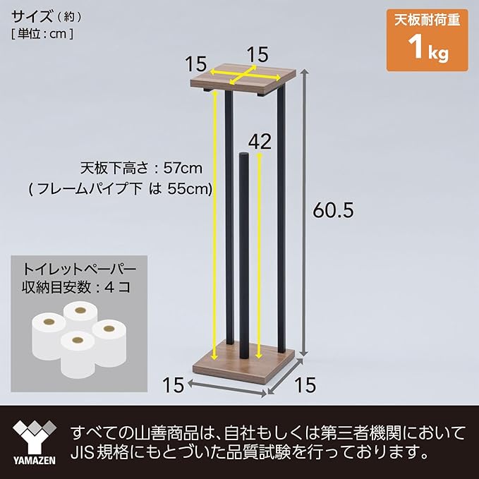●本体サイズ(約):幅15 奥行15 高さ60.5cm●天板サイズ : 15 15cm●ポールの長さ(約) : 42cm(ペーパー収納目安 : 4個程度)●天板耐荷重 : 1kg●構造部材 : フレーム/金属(スチール)、棚板 : 合成樹脂化粧パーティクルボード(メラミン樹脂)●表面加工 : フレーム/エポキシ樹脂塗装