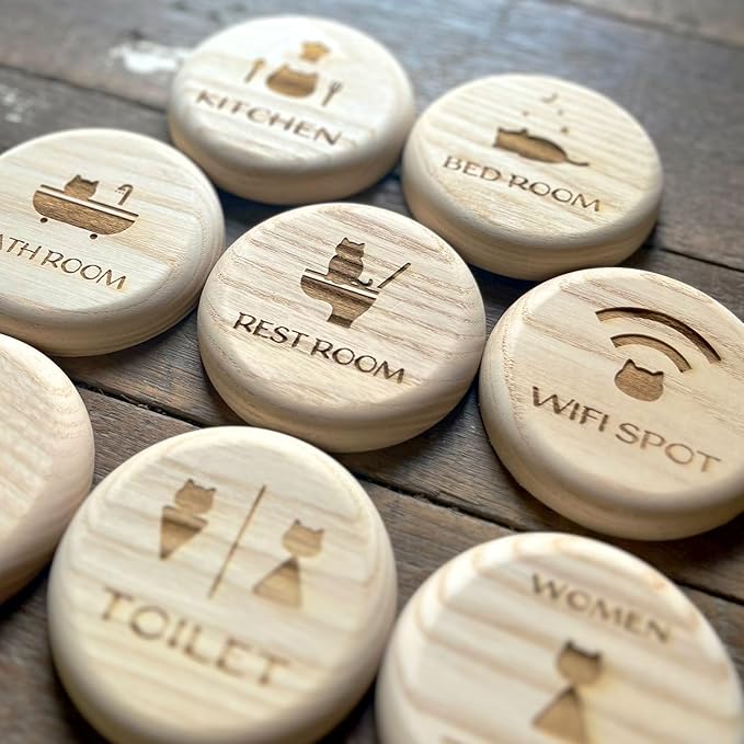 【商品説明】アッシュで作ったサインプレート。トイレ、お風呂、ベットルーム、Wi-Fi全8種。かわいい猫ちゃんが、場所を示してくれます。裏側には、両面テープがついているのですぐにご使用いただけます。壁やドアなどに貼って使ってもよし、置いて飾ってもよし、猫ちゃんの前に置いてみてもよしの商品になっております。