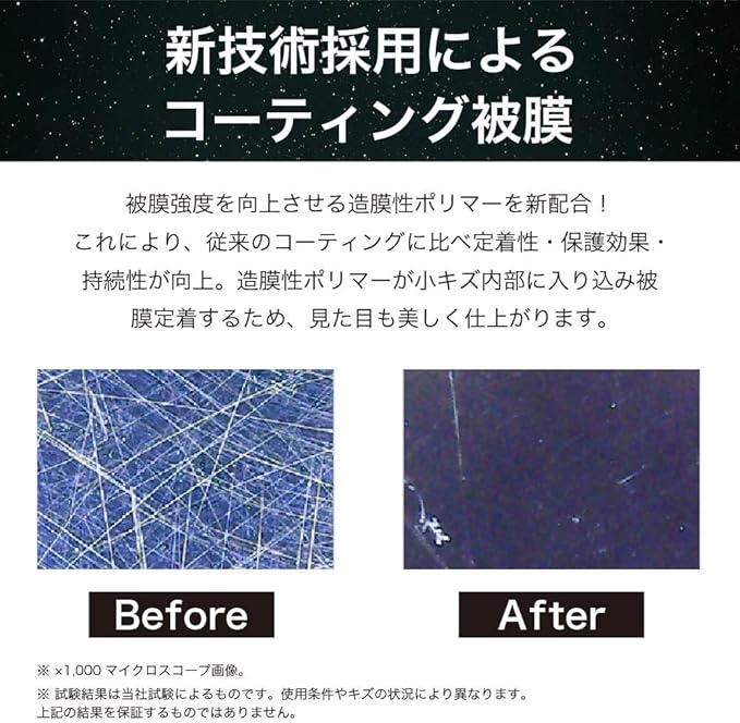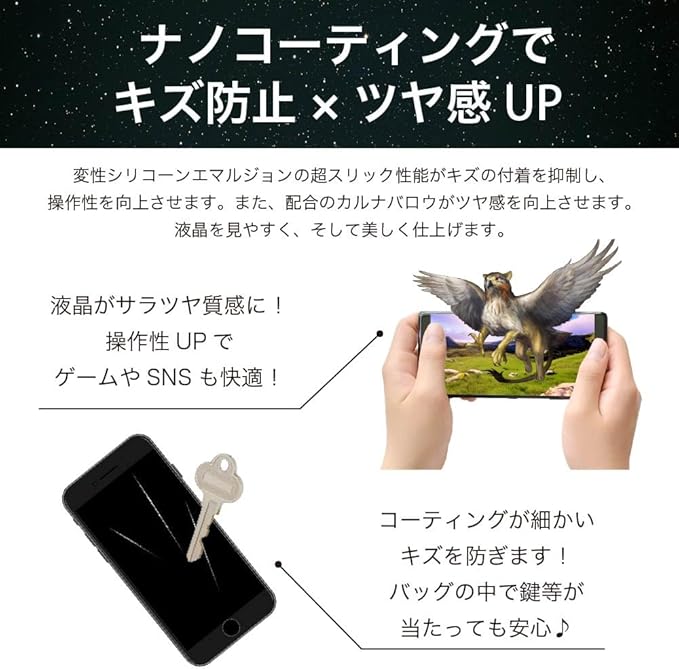■注意事項 スマホガードG> ・用途以外には使用しないでください。 ・作業の際は換気を行ってください。 ・素材を傷める恐れがあるため、液を付けたまま長時間放置しないでください。 ・直射日光下や塗布部分温度が高温の場合は使用しないでください。乾燥が早くなり、色ムラやシミの原因となります。 ・ブラックパネルへのご使用の際は、キズの原因となるため強くこすらないでください。 ・万一ムラができてしまった場合、水で湿らせ固く絞ったクロスで拭き取り再度施工してください。 ・カーナビやスマートフォンの画面に使用する場合は、センサー、マイク、スピーカー、端子部等に液が付着しないよう注意してください。 ・ノングレア加工されているカーナビ画面は微細な凹凸があるため、液剤が入り込みムラになる恐れがあるため使用しないでください。 ・アップル社のマックブックモニターは特殊加工が施されているため使用しないでください。 ・窓ガラスには使用しないでください。