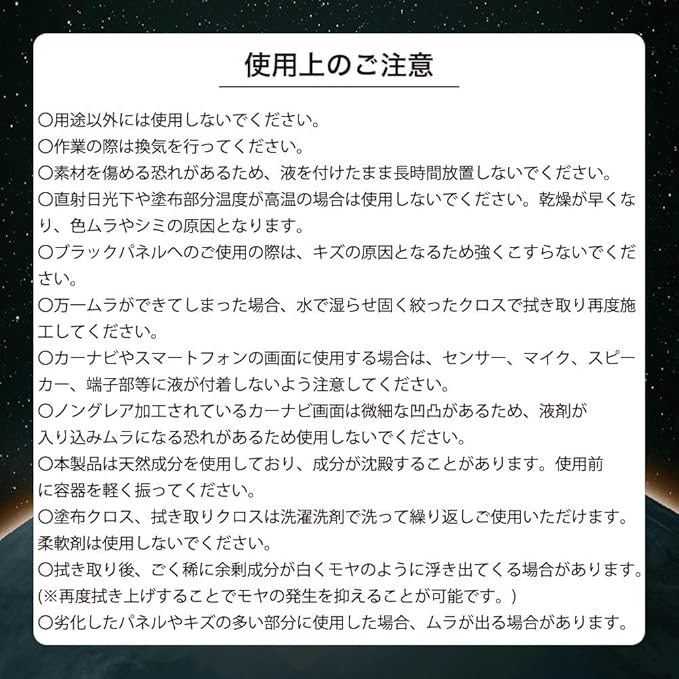 ・ノングレア加工されているカーナビ画面は微細な凹凸があるため、液剤が入り込みムラになる恐れがあるため使用しないでください。