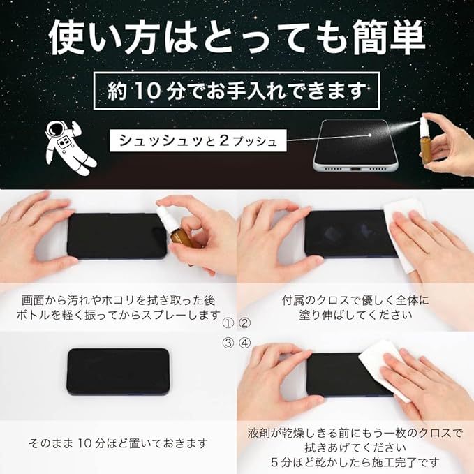 ■スマホガードGの特徴 たった10分でお手入れ完了! 汚れや指紋を防ぎ、軽く拭くだけでピカピカに! ・操作性UP&キズ防止で快適なタッチ操作を実現 ・抗菌成分配合で清潔キープ ・スマホ約100台分使える大容量10ml入り ・タブレットやゲーム機など幅広く使える万能タイプ