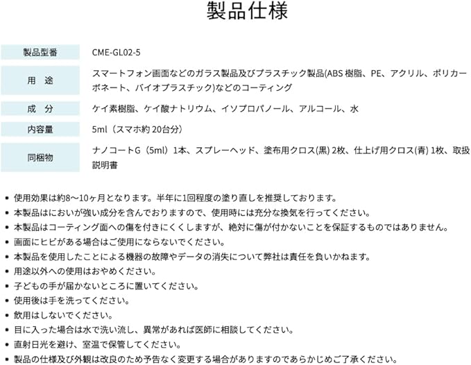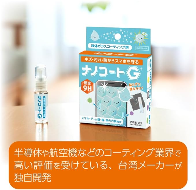 スマートフォンの液晶画面に、ナノコートGを塗布することで、微細なナノ粒子による保護膜が形成されるので、汚れやほこり、雑菌、指紋などがつきにくくなります。また、塗布することにより、摩擦が減るためキズもつきにくくなり、なめらかなタッチで操作性もUPします。 ガラス・樹脂製品に塗布することで艶と光沢を与え傷が付きにくくなる液体ガラスコーティング剤です。どなたでも簡単に塗ることができます。