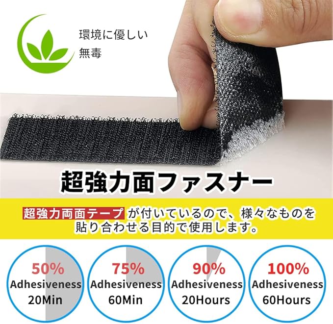 【面ファスナー】ポリエステル製で耐水性に優れ、フック側とループ側が水に濡れても強力なかみ合わせて接着力が何回も利用できます。