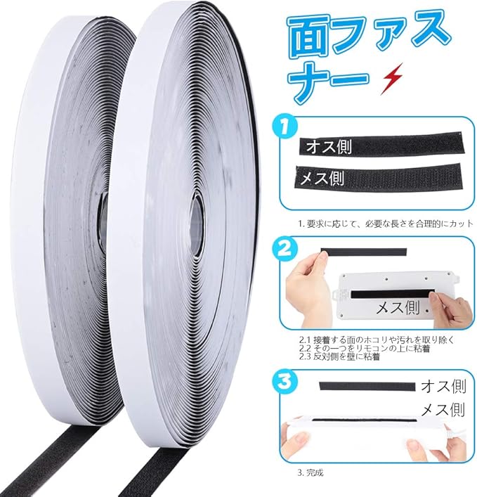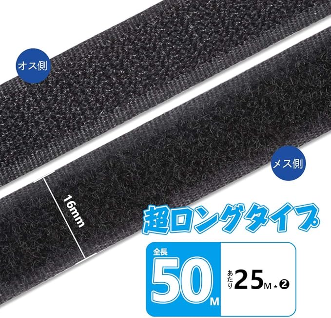 50m面ファスナーお得 パッケージ内容:強力面ファスナー オス1巻+強力面ファスナー メス 1巻 サイズ:25M 16mm(あたり) 合計50m 色:ブラック 50メートル超ロング面ファスナーで、惜しみ無くさまざまなものに利用可能です。