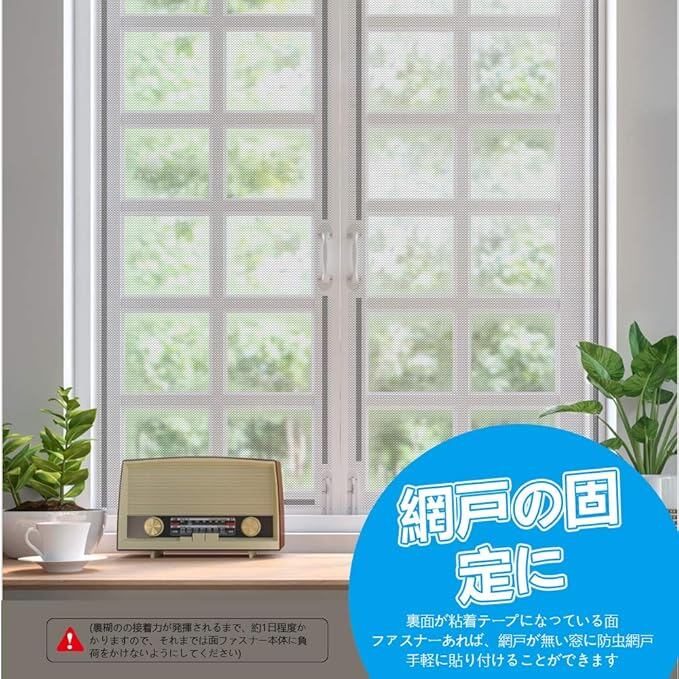 網戸の固定にぴったり 裏面が粘着テープになっている面ファスナーあれば、網戸が無い窓に防虫網戸手軽に貼り付けることができます。しかも、窓枠からいつでも取り外せて、また取り付けることが可能なのも便利です。