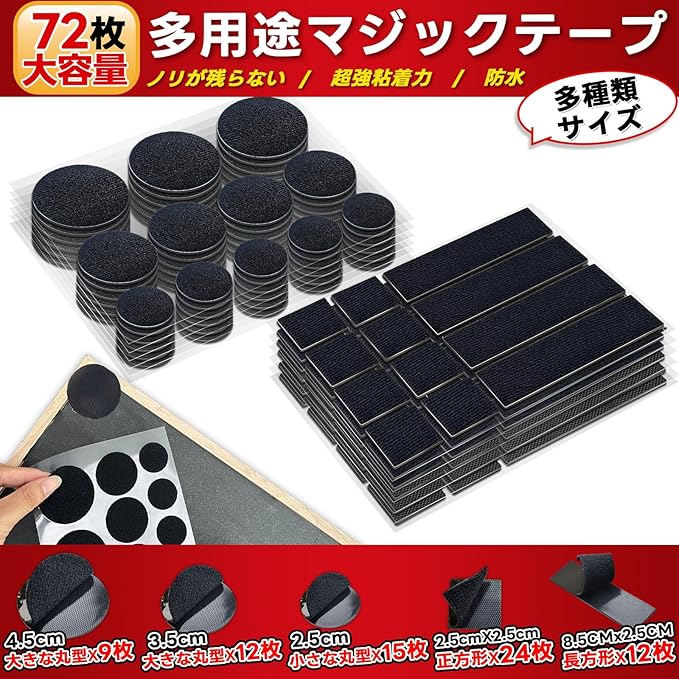 面ファスナー マジックテープ 両面テープ 剥がせる両面テープ【貼って剥がせる、ノリが残らず】 ベルクロ両面テープ 超強力粘着テープ 防水 耐熱 防じん 工業用 業務用 家庭用 手芸用 網戸用 オス メス 多種類サイズ【大円形9枚 中円形12枚 小円形15枚 正方形24枚 長方形12枚、大容量72枚セット】