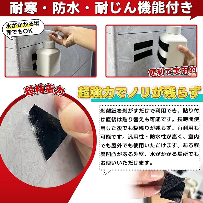 【防水・耐熱・優れた耐久性】超強力マジックテープは防水仕様で、浴室の収納にも対応。耐熱性と防水性を兼ね備えており、室内、車内、キッチン、お風呂など多彩なシーンでご利用いただけます。プラスチック、金属、木材、樹脂、タイルなど、さまざまな素材に適応します。カーペットの滑り止めや壁飾り、小物収納にもおすすめです。