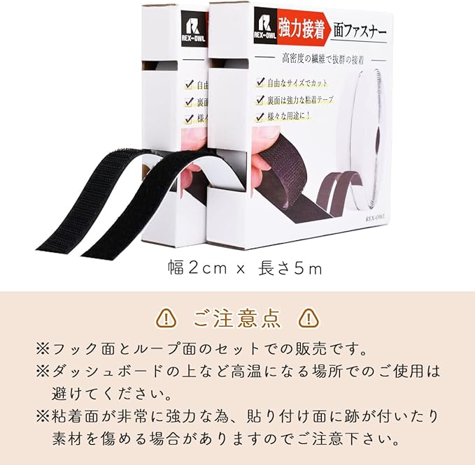 REX-OWL マジック 両面テープ付き 超強力 ベルクロ 布 両面テープ 面ファスナー 車 テープ オス メス MFN-01 (幅2cm 長さ5m, ブラック)