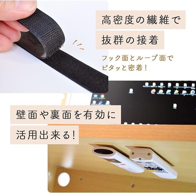 【高密度繊維でしっかり接着】 しっかり留まって、剥がす時は簡単!高密度繊維でしっかり留まる強力面ファスナー。フック面とループ面に耐久性があるので、繰り返し使えます。