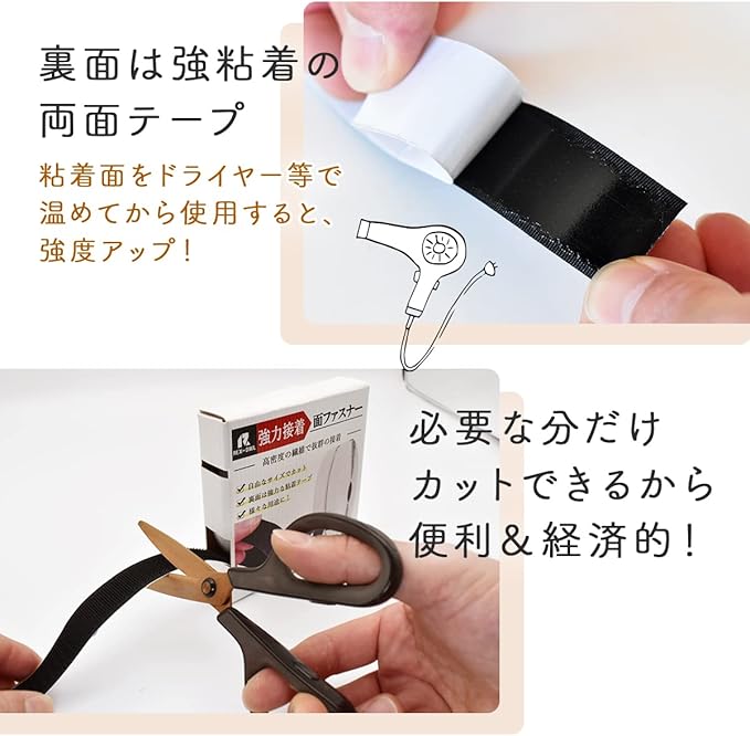 【使いやすいオリジナルパッケージ】フック面とループ面、それぞれオリジナル穴あき収納ケースに入れてお届けします。テープがほどけてバラバラにならず、最後までスッキリ使えます。 ※本商品はさまざまな素材への使用を想定しておりますが、金属・木製・布製品を含め、素材表面の凹凸や繊維の状態、接着面との相性などにより、使用環境によっては粘着力が十分に発揮されにくい場合がございます。