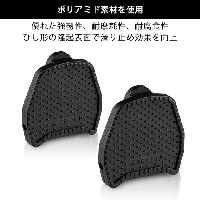 【耐久性と滑り止め】 ペダルプレートは高耐久性のナイロンPA612を使用し、表面は滑り止め加工されています。