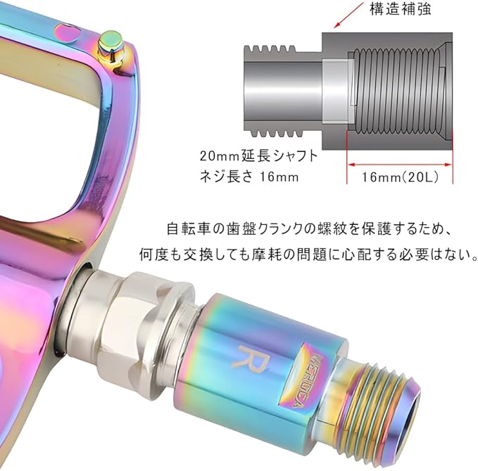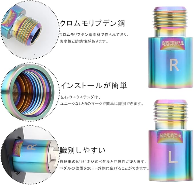 適用範囲:自転車の9/16"ネジ式ペダルと互換性があります、ペダルの位置を20mm外側に広げることができます。片側に2つのエクステンダーを併用し、片側の伸びは40mmに達します。 (たとえば、LLスプライシングが使用され、RRスプライシングが使用されます。)