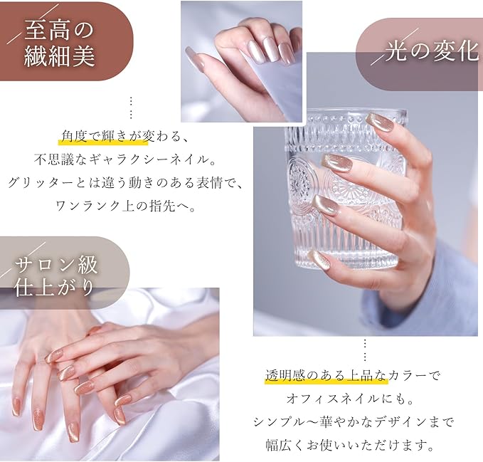 【幻想的な輝きと立体感】マグネットを近づけるだけで、色の奥から浮かび上がるようなラインやきらめきが現れます。光の角度によって輝きが変わり、手を動かすたびに視線を惹きつける魅力的な仕上がり。