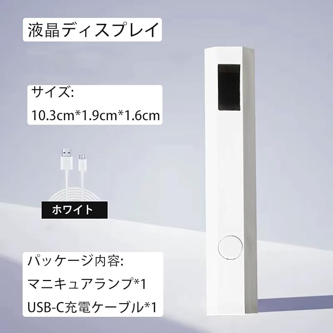 【製品仕様】サイズ: 10.3cm*1.9cm*1.6cm、パッケージ内容: マニキュアランプ*1、USB-C充電ケーブル*1。