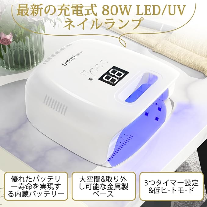 Nail girls コードレス UV LED ネイルランプ、80W 充電式ネイルドライヤー ジェルポリッシュライト、インテリジェント自動センサー LCD ディスプレイ ネイルランプ、ポータブル 42 ビーズ LED ネイルライト 3 タイマー設定付き 手足両用