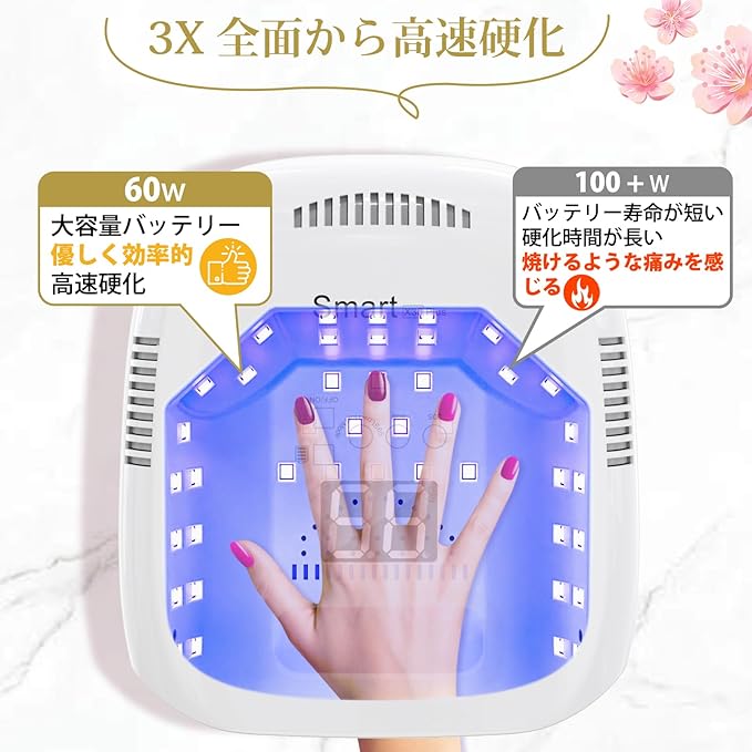 【3段階タイマー機能&タッチスLCD表示】硬化 用 uv ライトには30秒、60秒、90秒 (無痛モード)3つのタイマーを搭載します,硬化時間を簡単に選択できます。さらに、99S低熱モードが搭載して、硬化熱を和らげます。また、硬化ライトは、大型LCDディスプレイを採用、残り時間が一目で硬化時間が見やすくになります。これにより、初心者でも簡単に操作でき、ジェルもレジンも楽しみ、ほとんどのジェルネイルに対応しています。