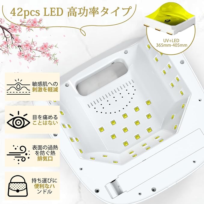 【2025最新UV+LED二重光源】ledネイルライトは、最新のUVとLED二重光源をを採用しています。波長は365+405nmと幅広い範囲なので、硬化時間を効果的に短縮し、従来のジェルネイルライトよりの3倍の速さで硬化することができます。レジンライトは42個のLEDランプビーズが配置されており、真上・奥・側面など、サイドや親指爪を均一に乾燥させることができます。ネイルアートやフットケア、マニキュアやレジンなどのサロンに対応しています。