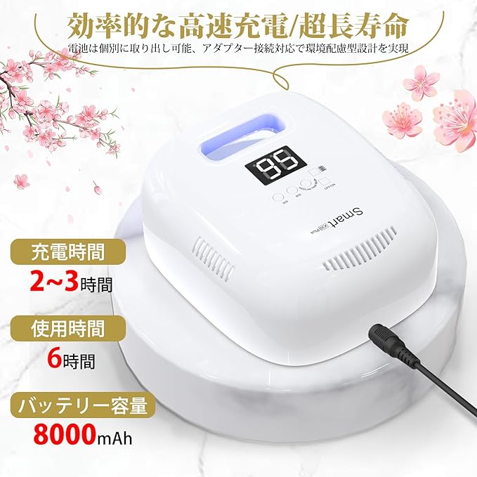 【充電式コードレスLEDネイルライト】充電式UVネイル ライトは大容量の8000mAhバッテリー内蔵の充電タイプです。コードレスだから設置場所を問わず、どこでもご使用可能!約3時間のフル充電で、最大6時間使用できる。 いつでもどこでもワイヤレスで使用でき、とても便利です。 女性の贈り物にぴったりです。