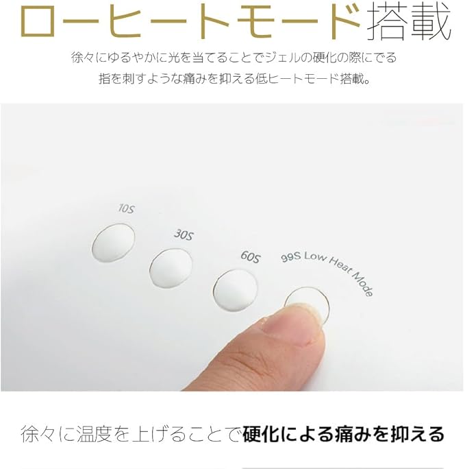 ●ローヒートモード(99秒カウント) ①「99S Low Heat Mode」のボタン押すとローヒートモードになり、99秒間ライトが 点灯致します。※このモードは、秒数が増えるごとにライトの光度が変わり硬化による 痛みを低減させる効果のあるモードとなります。