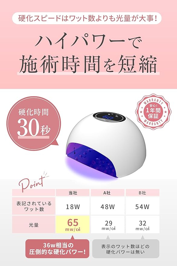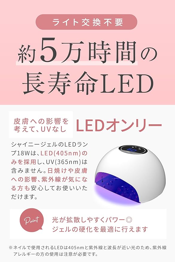 ✅皮膚への影響を考え、365nmのUV波長は採用せず、405nmのLED波長のみを搭載。 ライト交換不要・約5万時間の長寿命LED!