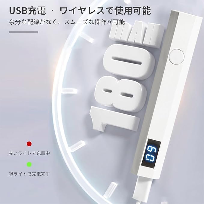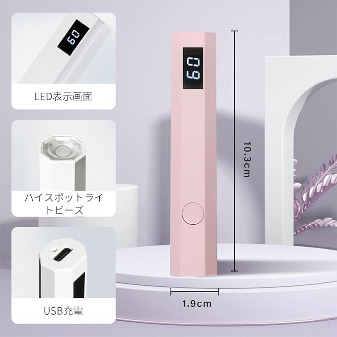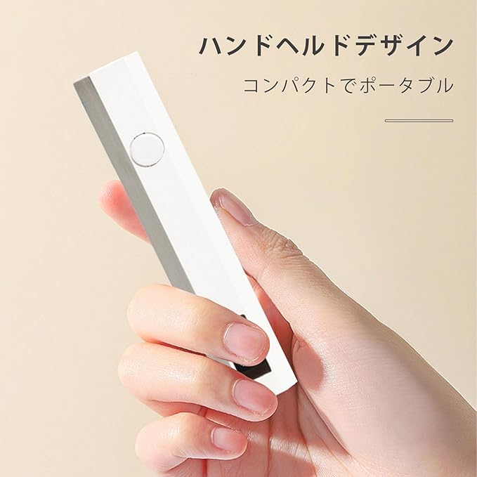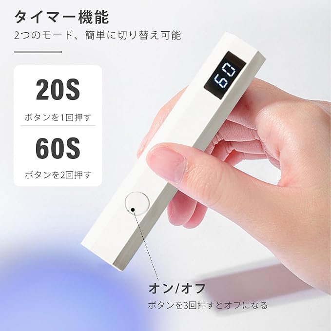 【商品仕様】サイズ:103mm 16mm 19mm、重量:20g、バッテリー容量:180mah、定格電力:3W。 パッケージ内容:ネイルライト 1、USB-C充電ケーブル 1。