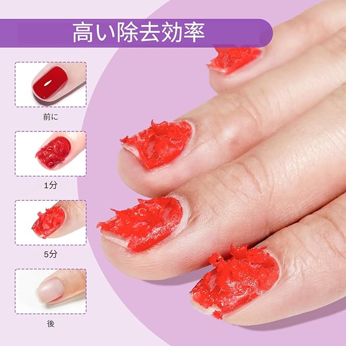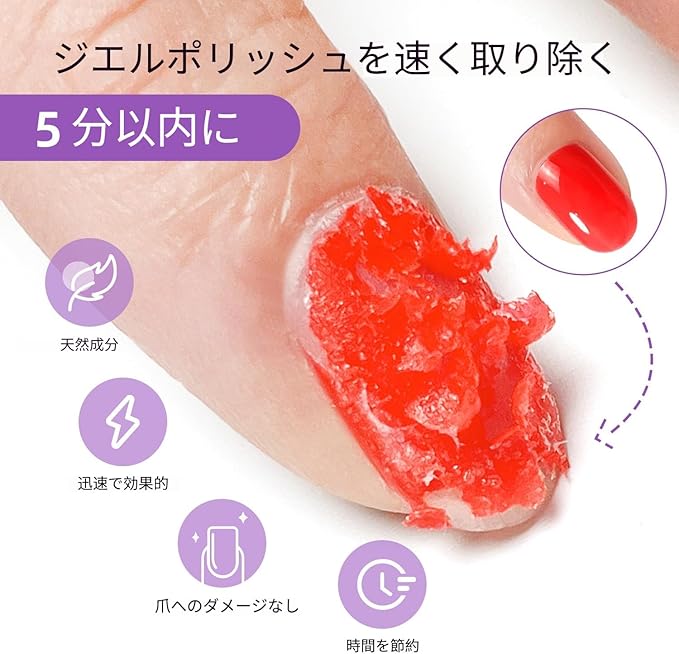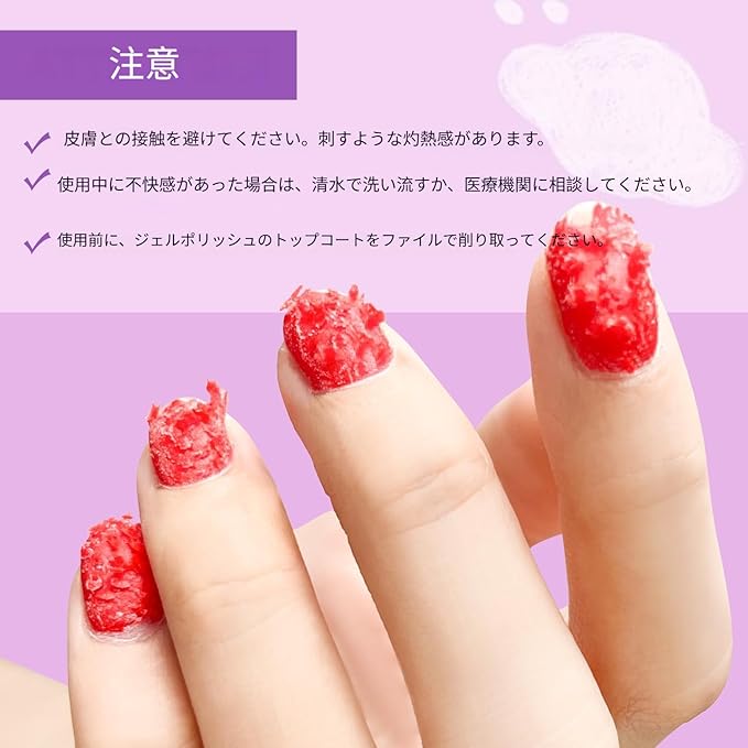 ご注意:ネイルポリッシュの厚さによって、オフに必要な時間は異なります。UVポリッシュやネイルエクステンションの場合は、まずシール層を剥がしてから、口元や肌に触れないようにしてください。ご質問がございましたら、お気軽にお問い合わせください。