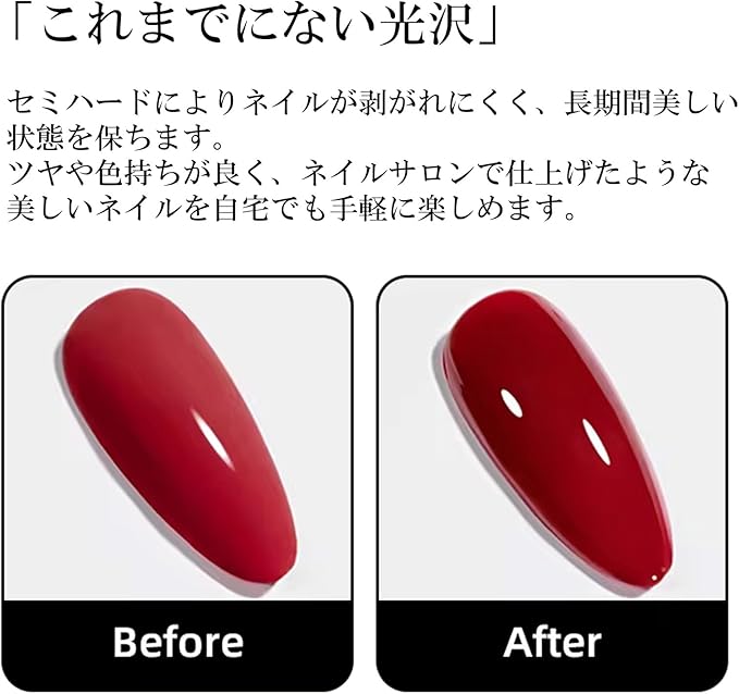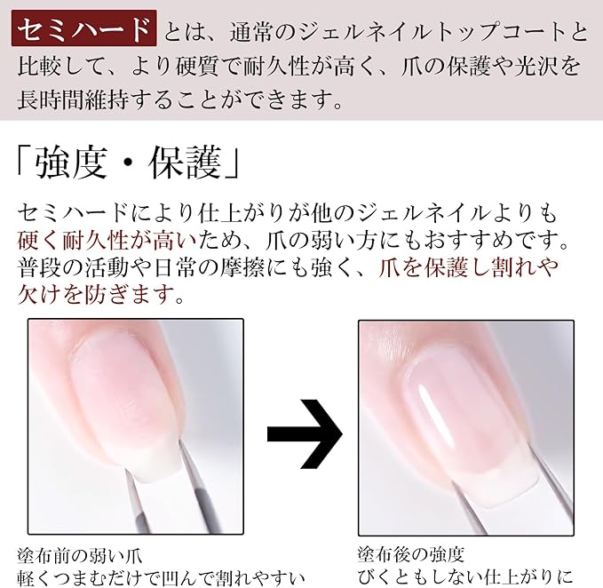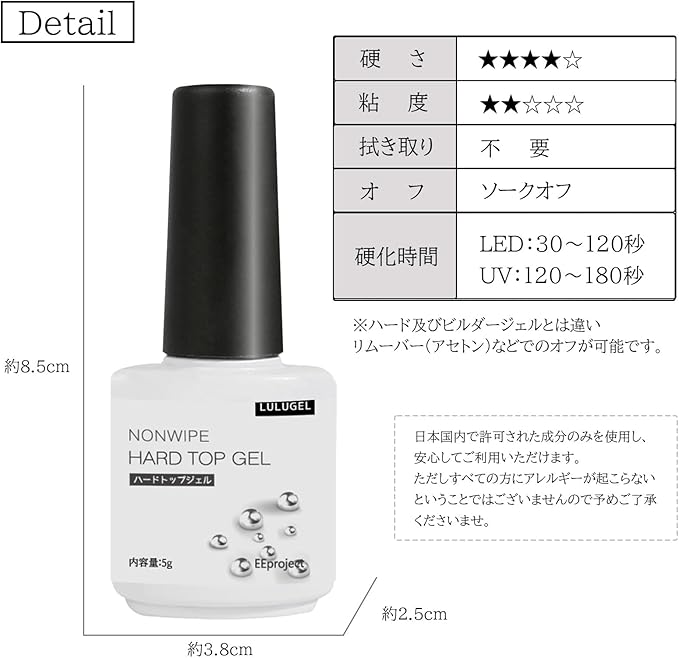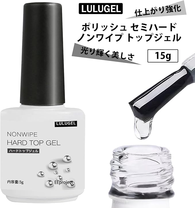 【LULUGEL セミハード トップジェル】内容量:15ml 硬化時間:【LED】約30~120秒 【UV】約120~180秒 ※塗量や色によって硬化時間が異なる場合がございます。