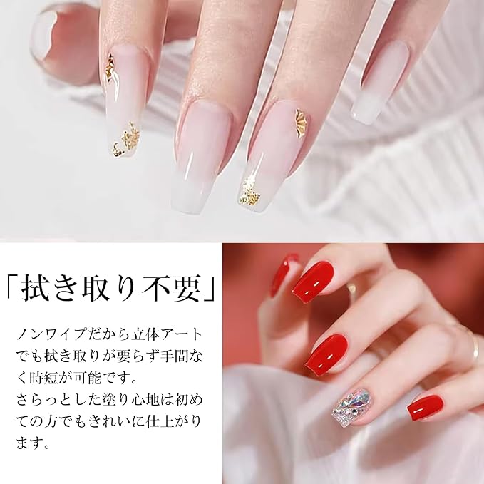 硬化後のベタベタした未硬化ジェルが出ないから、硬化後の拭き取り不要。 ワイプやクリーナーなど不要で経済的〇。