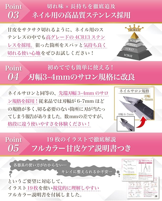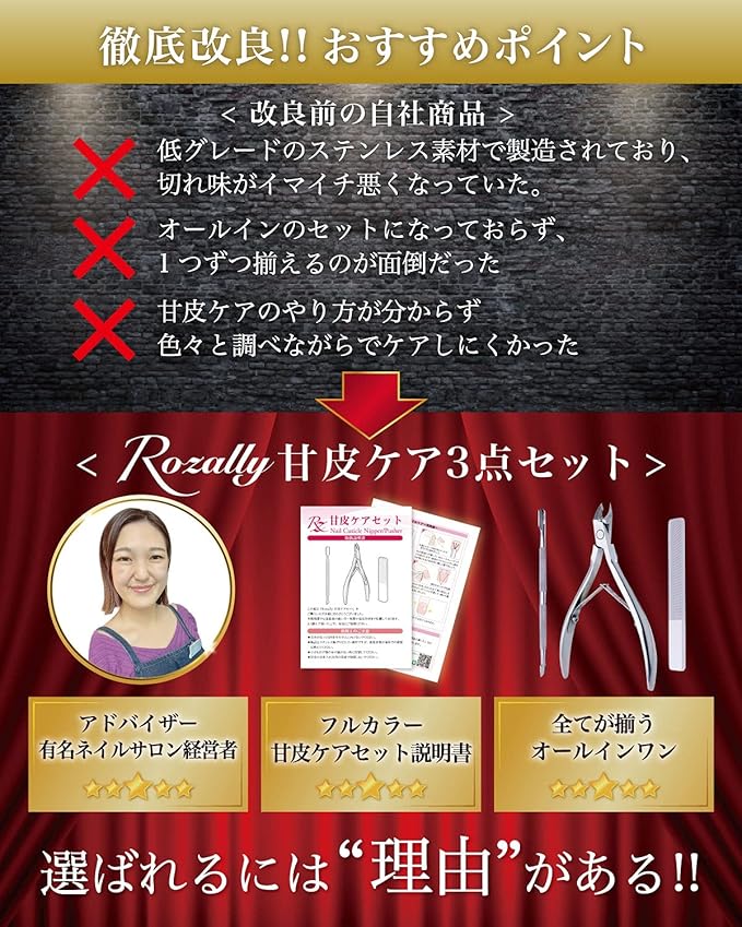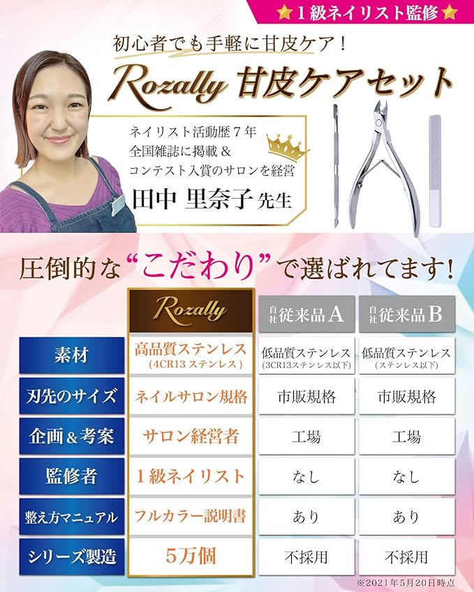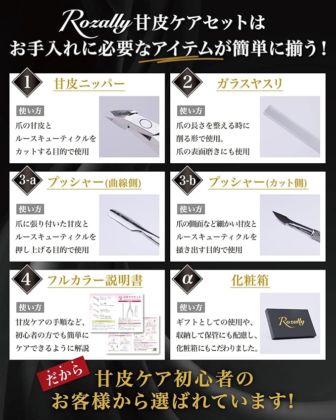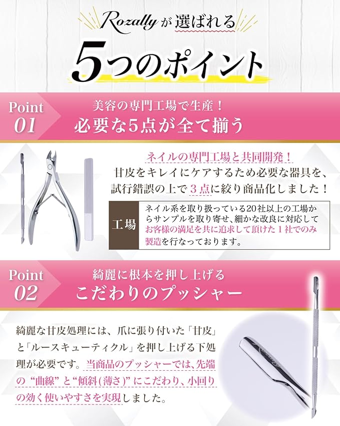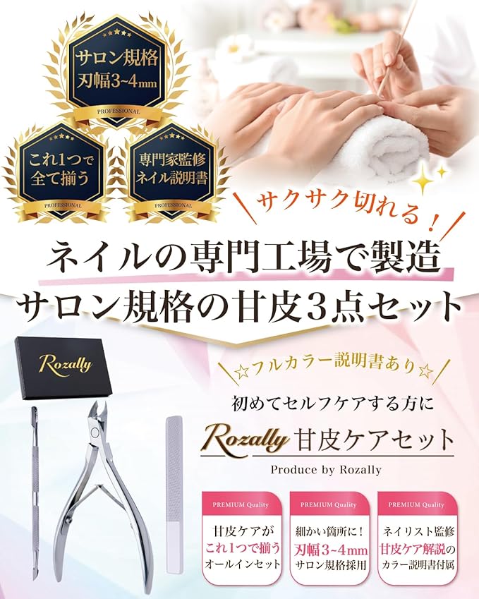 【こだわり】 様々なHOTから” 甘皮 ニッパー ”や” ネイルセット ”が販売されています。 Rozallyの ネイルケアセット は国内や国外で流通している様々なサンプルを取り寄せ、”噛み合わせ”と”切れ味”にこだわりを持って製造しました。初心者の方でも届いた日に あまかわ処理 ができるように、”キューティクルニッパー”と”プッシャー”と”爪やすり”をセットにして、フルカラーの説明書を付属したセット商品となっております。 爪 の事をしっかり考えたネイルセットを規格してスムーズな”あまがわ処理”ができるように規格しています。