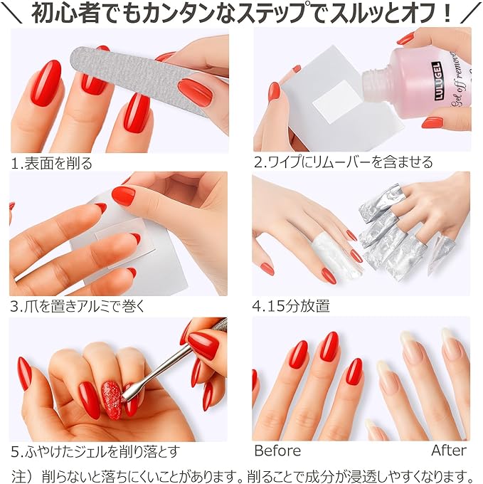 【ジェル ネイル セルフ 落とし 方】ファイルなどで表面を削りアルミなどで15分程度、 ジェルネイルリムーバーを含ませる事でジェルが柔らかくなりオフしやすくなります。 オフ後にはキューティクルオイルなどで ケアをおすすめしております。LULUGEL除 光液 爪に優しいアセトンリムーバーは、ネイル オフや、ネイルチップ 接着剤 リムー バーとして、サロンワーク、ジェルネイル セルフに活躍します。